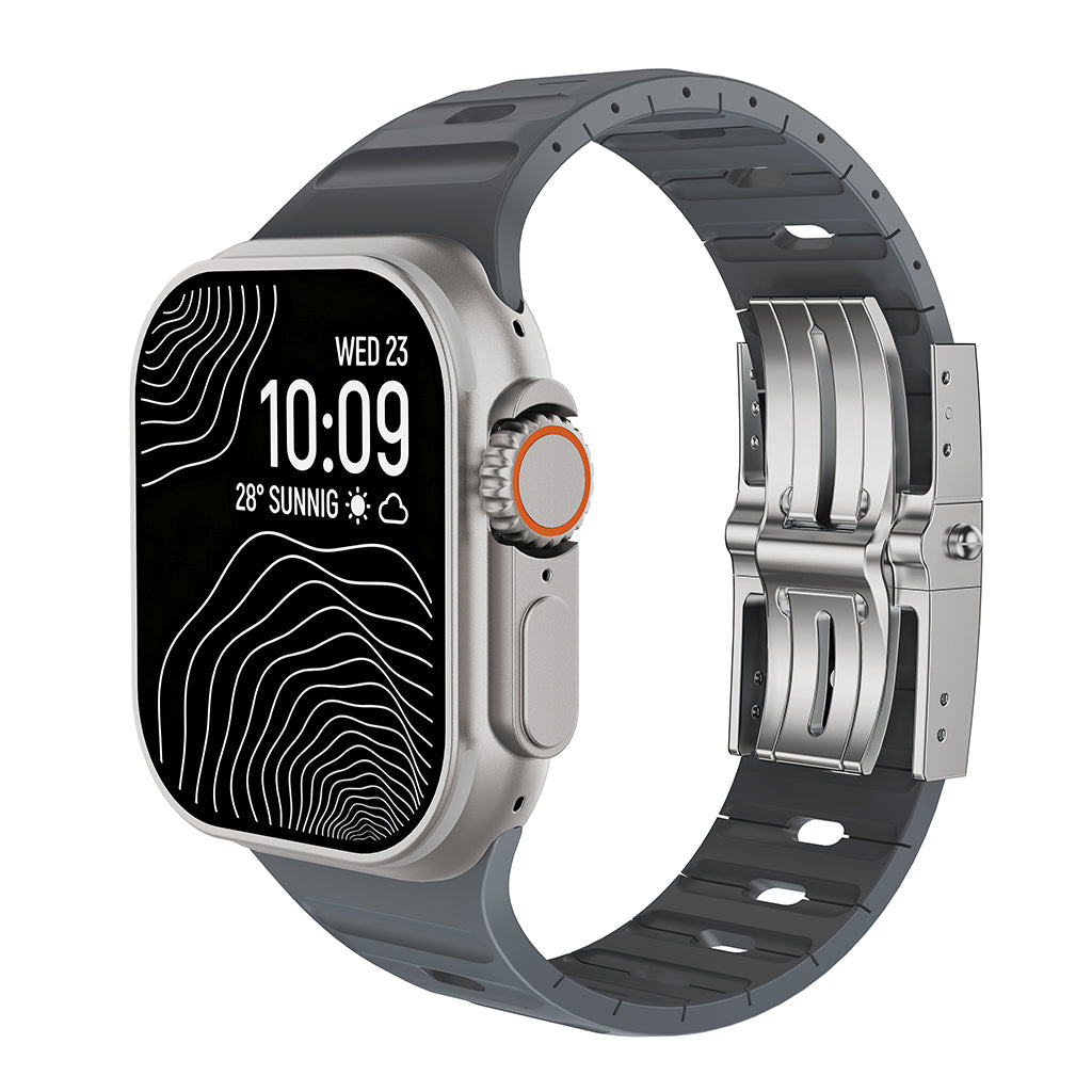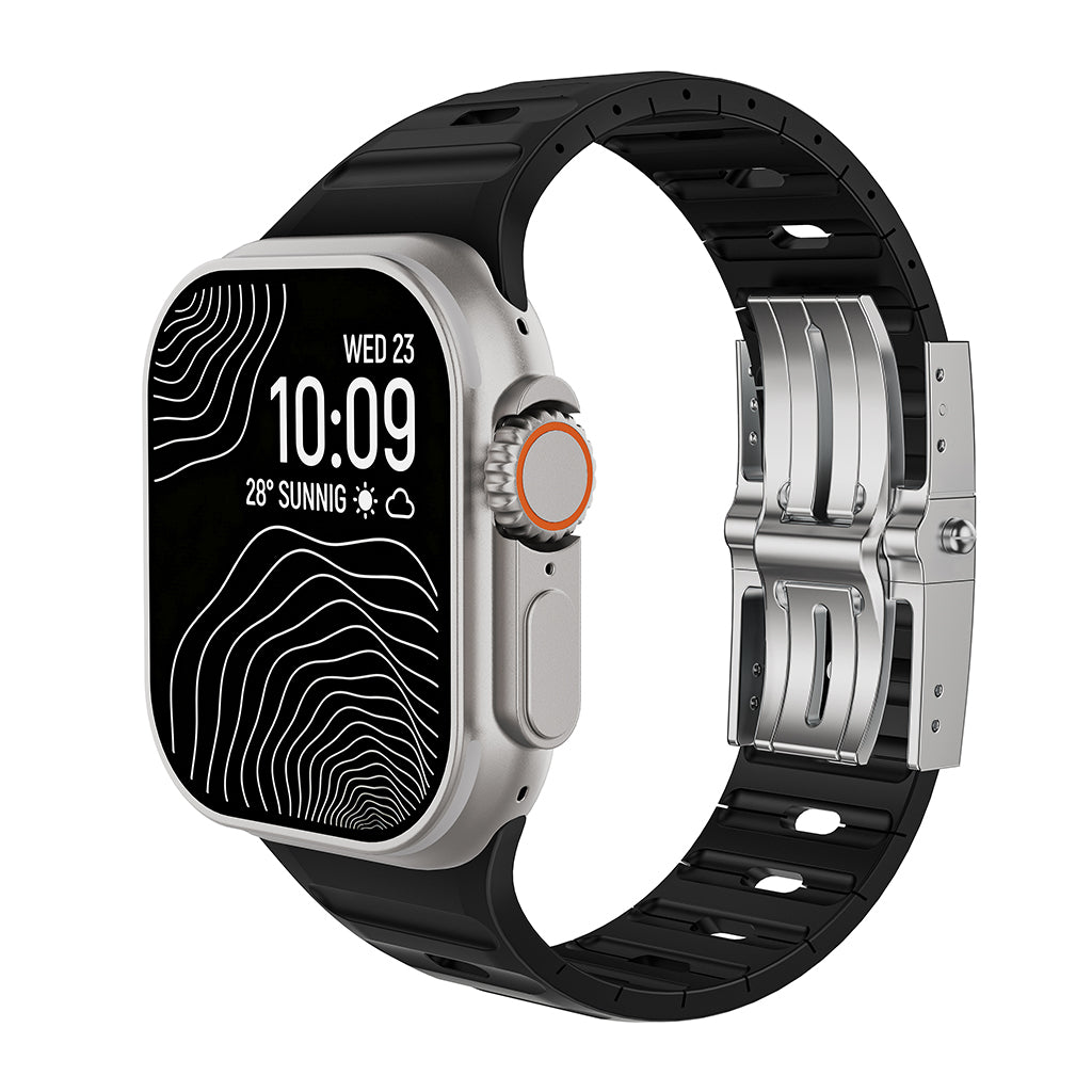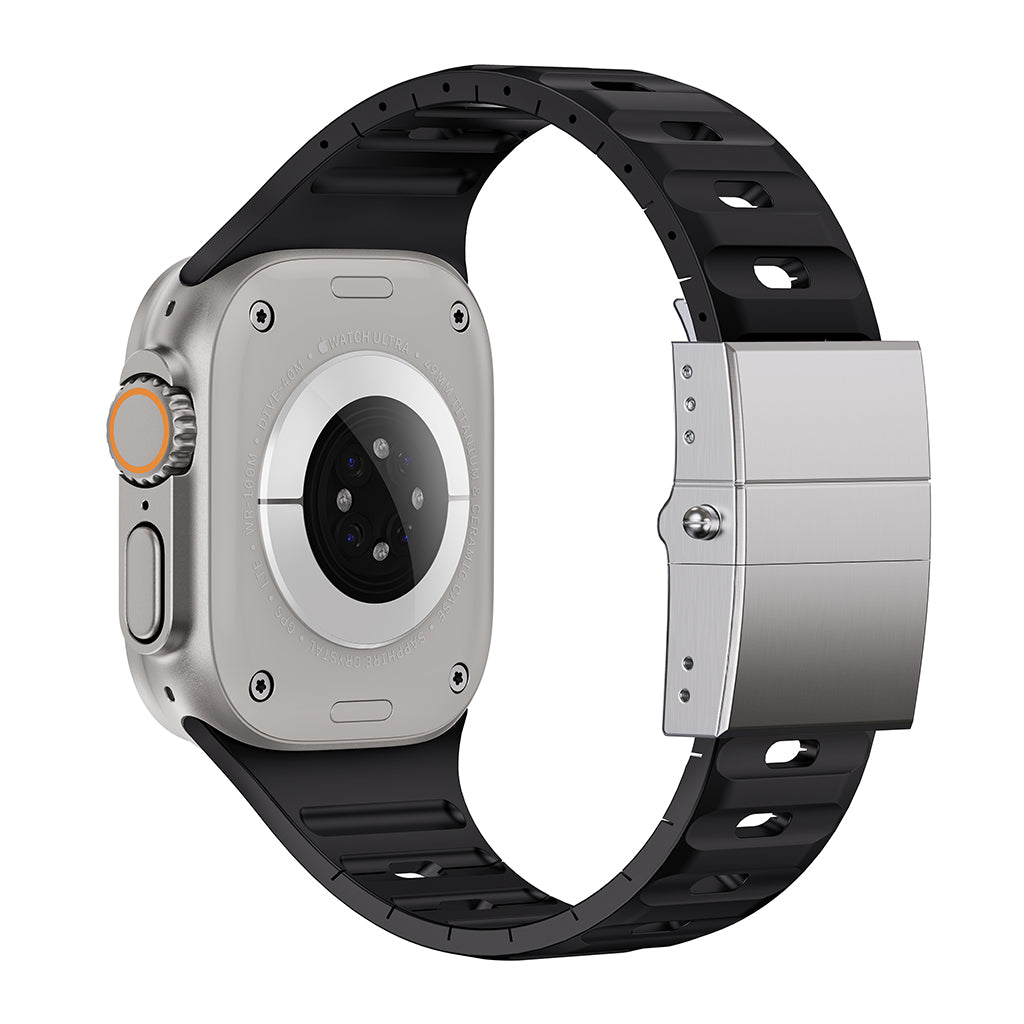 Architectural Design: The unique aerodynamic "ribbed" texture enhances breathability, ensuring your wrist stays cool and dry. Its bold, structured silhouette perfectly complements the rugged titanium of the Apple Watch Ultra.