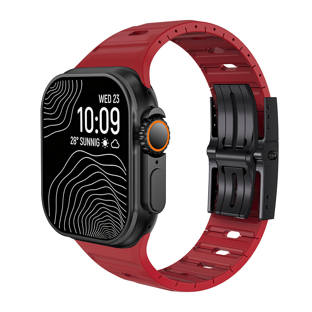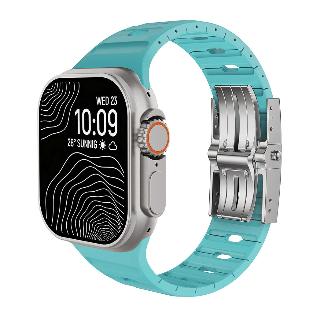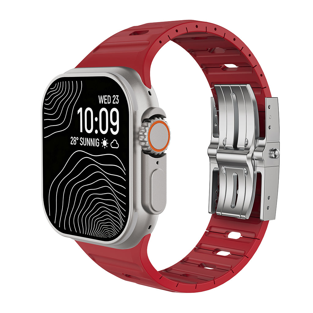 Architectural Design: The unique aerodynamic "ribbed" texture enhances breathability, ensuring your wrist stays cool and dry. Its bold, structured silhouette perfectly complements the rugged titanium of the Apple Watch Ultra.